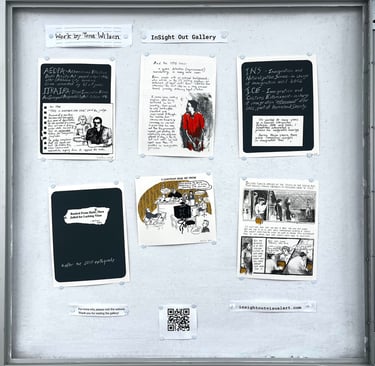 The work shown at Insight Out gallery is a small selection of pages from Tona Wilson’s handmade artist’s book, Stories Behind Bars, which was produced at Women’s Studio Workshop in 2010, in an edition of 50. The stories and information come from her time working as a Spanish interpreter in prisons, jails and courtrooms, much of it from the 1990’s. There are four sections, housed in a box with a barred window. The pages here are from two of the four sections: “Acronyms and Sketches” and “Being Removed.”You can see more information about the book at https://wsworkshop.org/collection/stories-behind-bars/ And see a pdf of the book at https://wsworkshop.org/wp-content/uploads/collection-item/stories-behind-bars/pdf/stories-behind-bars-reduced.pdf